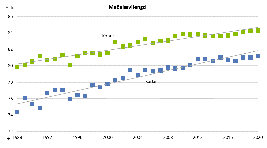 Meðalævilengd karla á Íslandi var 81,2 ár árið 2020 og meðalævilengd kvenna 84,3 ár en meðalævilengd sýnir hve mörg ár einstaklingur á að meðaltali ólifuð við fæðingu ef miðað er við aldursbundna dánartíðni mannfjöldans. Aldursbundin dánartíðni hefur lækkað á undanförnum áratugum og má því vænta þess að fólk lifi að jafnaði lengur en reiknuð meðalævilengd segir til um.