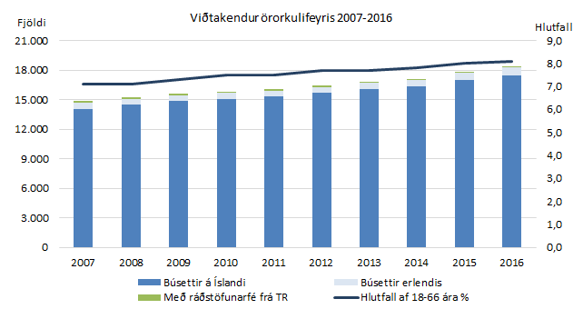 Örorkulífeyrisþegar voru 18.415 í desember árið 2016 og hafði fjölgað um 639 (3,6%) frá desember 2015. Frá árinu 2007 hefur örorkulífeyrisþegum fjölgað um 3.560 eða 24%, en um tæp 15% að teknu tilliti til mannfjölda 18 til 66 ára.