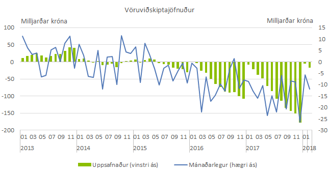 Á tímabilinu janúar til febrúar 2018 voru fluttar út vörur fyrir 94,5 milljarða króna en inn fyrir 111,2 milljarða (118,5 milljarða króna cif). Því var halli á vöruskiptum við útlönd sem nam 16,7 milljörðum króna reiknað á fob verðmæti. Á sama tíma fyrir ári voru vöruviðskiptin óhagstæð um 21,4 milljarða á gengi hvors árs. Vöruviðskiptahallinn janúar til febrúar er því 4,7 milljörðum lægri en á sama tíma fyrir ári síðan. Án skipa og flugvéla nam vöruviðskiptahallinn 10,0 milljörðum króna, samanborið við 21,3 milljarða króna á sama tíma árið áður.