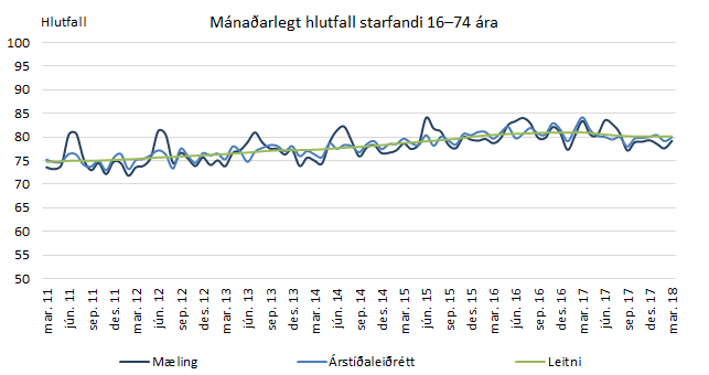 Íslenskur vinnumarkaður sveiflast reglulega milli mánaða vegna árstíðabundinna þátta. Samkvæmt árstíðaleiðréttum tölum var fjöldi fólks á vinnumarkaði 204.800 í mars 2018 sem jafngildir 82% atvinnuþátttöku, en það er aukning um eitt prósentustig frá febrúar. Áætlaður fjöldi atvinnulausra í mars var samkvæmt árstíðaleiðréttingunni 5.200 og jókst um 700 manns frá áætluðum fjölda í febrúar. Hlutfall atvinnulausra hækkaði því á milli febrúar og mars 2018 um 0,3 prósentustig, úr 2,2% í 2,5%. Leiðrétt hlutfall starfandi fólks í mars 2018 var 79,9%, sem er 0,8 prósentustigum hærra en það var í febrúar. Áætlaður fjöldi utan vinnumarkaðar lækkaði úr 47.100 í 45.000 á milli mánaða, eða um 2.100 manns. Þrátt fyrir að einhverjar breytingar megi sjá bæði í mælingunni sjálfri og í árstíðaleiðréttum tölum þá sýnir leitni hlutfalls síðustu sex mánaða að allar vinnuaflstölur standa nánast í stað. Hvort heldur sem litið er til atvinnuþátttöku, hlutfalls starfandi, atvinnuleysis eða vinnustunda.